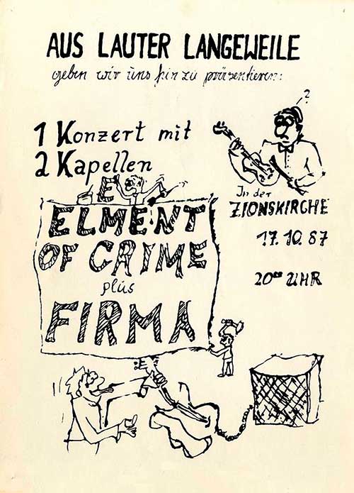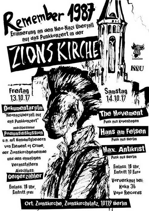 Para el concierto de 17 de octubre de 1987, el pastor Simon tuvo que pedir permiso al concilio eclesiástico, que lo declaró ′servicio de oración con música′. La banda que iba a tocar de Berlín Este se llamaba Die Firma -el nombre con el que se conocía a la Stasi-. El guitarrista, Paul Landers, forma luego Rammstein, a la que se incorpora también el otro guitarrista, Richard Kruspe, así como el batería, Christoph Schneider. El grupo invitado de la parte occidental era Element of Crime. Para poder cruzar a la RDA tenían que hacerlo sin instrumentos, ocultando sus intenciones. Llevaban un pase de un día como turistas y utilizaban el equipo de sonido de Die Firma.
