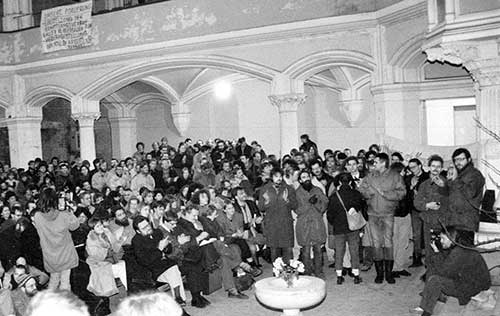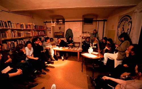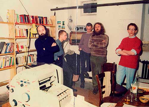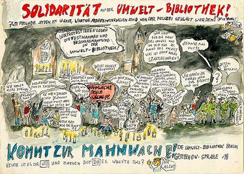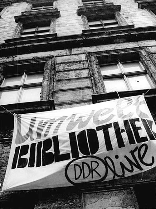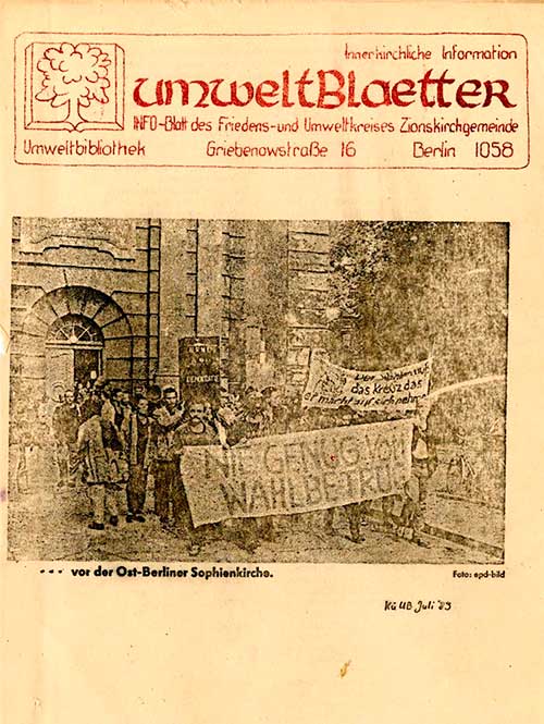 En los bajos de la casa parroquial en el número 16 de Griebenowstrasse albergaba el principal centro de encuentro disidente de Berlín Este. Era la ′Umweltbibliothek′ -la Biblioteca Medioambiental-. Allí estaba la única imprenta independiente de la República Democrática Alemana, que publicaba una gaceta ecologista y otra sobre derechos humanos. Eran aparentemente legales porque se hacían en papel timbrado de uso eclesiástico. En la cuarta planta había un café en el ático, donde se hacían exposiciones y conferencias. Todo bajo la protección de la iglesia luterana.