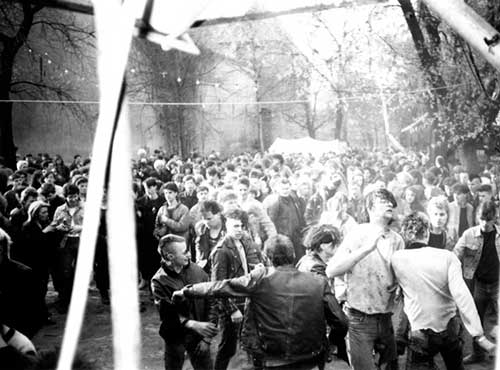 La Juventud Libre Alemana era la organización estatal a la que pertenecían los jóvenes desde los 14 años hasta su graduación. Tenían locales y organizaban tanto conciertos como excursiones. Publicaban una revista que se llamaba ′Die Trommel′. Todo para la gloria del ′socialismo′. No había mayor protesta entonces, que ser neonazi. Acababa de terminar el concierto en la iglesia luterana cuando los ′skins′ se presentaron entrando teatralmente en el templo en fila de a dos con el brazo derecho levantado con las proclamas nazis de ′¡Sieg Heil!′ y el insulto típico de ′¡cerdos!′. Llevaban botellas, bates, ′puños americanos′, barras y cadenas de hierro.